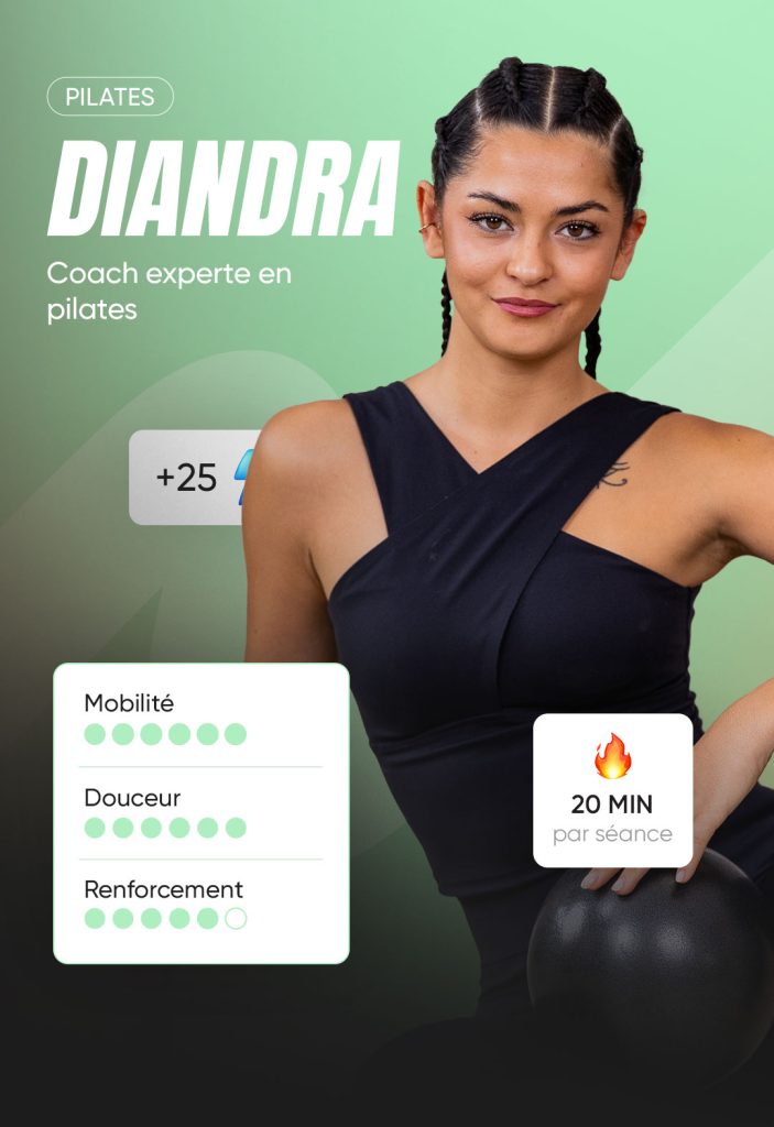 Hello, je suis Dianra ! Avec le Pilates Blossom, je t’accompagne en douceur pour entrer dans ta “clean girl era” en intégrant le Pilates ballon dans ta routine ! Grâce à ce programme guidé de 3 semaines, tu vas apprendre à écouter et stabiliser ton corps grâce à des séances de renforcement musculaire accessibles.