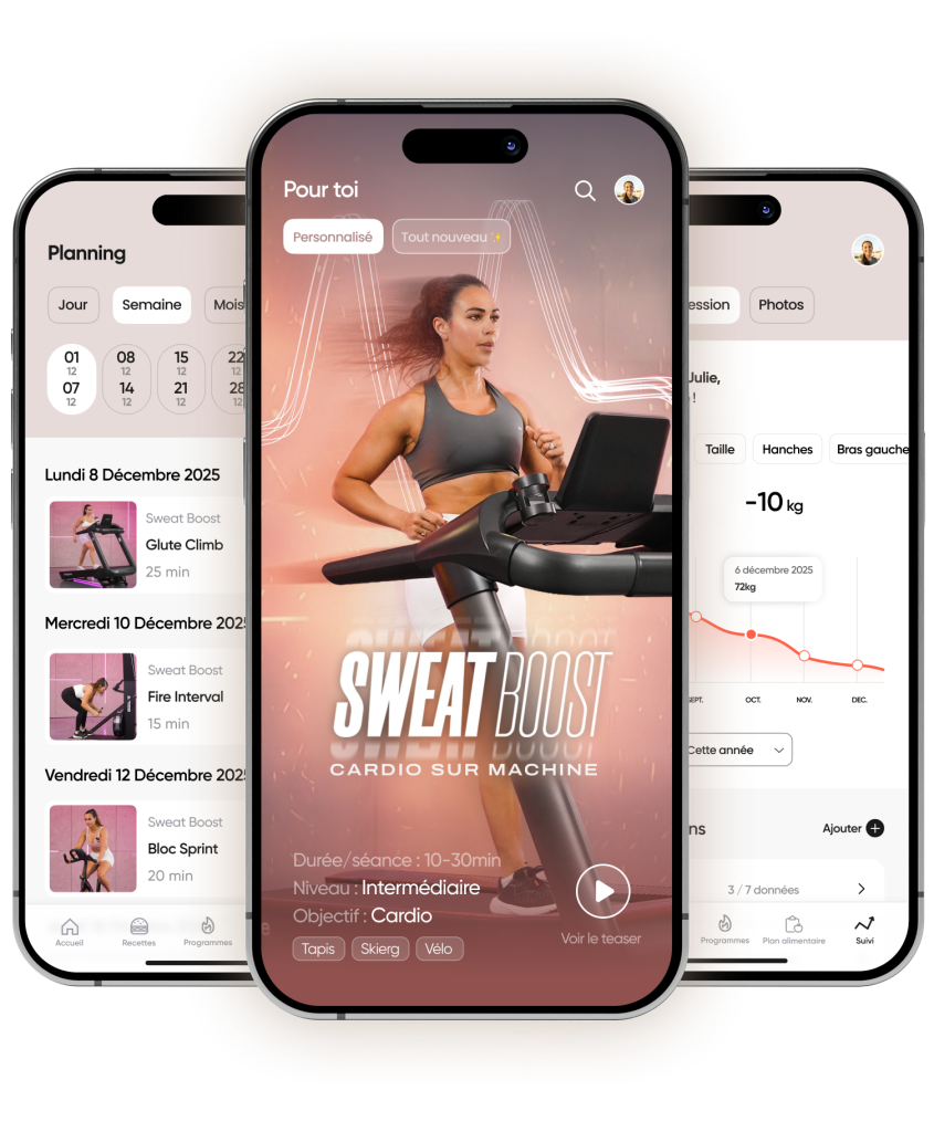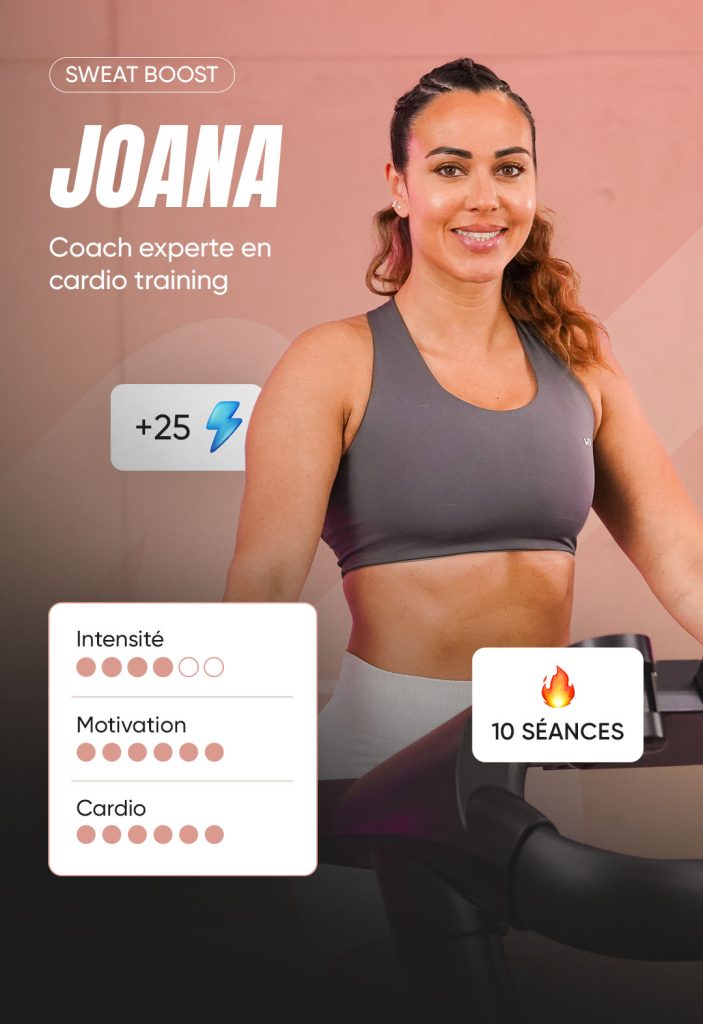 Avec le programme cardio Sweat Boost de niveau intermédiaire, je t’accompagne dans une pratique express et efficace en salle. Mes objectifs ? Améliorer ton endurance, te faire brûler des calories et travailler l’ensemble de ton corps avec des entraînements variés, fun et progressifs sur machine.