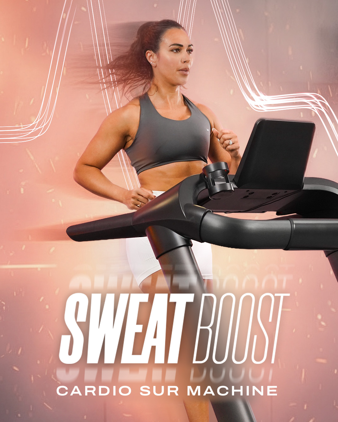 Le Sweat Boost est pensé en séances de cardio training express, sur tapis, SkiErg et vélo RPM. Il combine HIIT, intervalles, endurance et puissance pour te challenger sur différents formats, selon ton temps disponible et ton niveau !